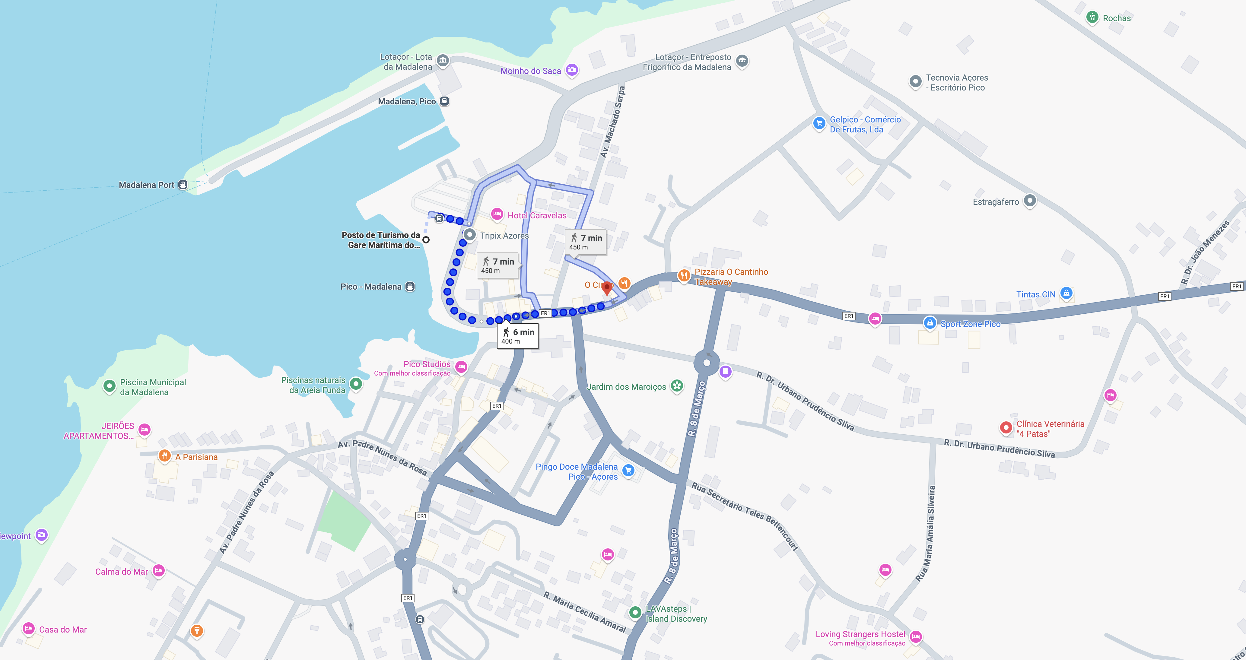 Ao sair do barco na Gare Marítima de São Roque, pode sempre encontrar transportes públicos, táxis ou mesmo alugar um automóvel. Assim que sair do parque, vira à direita. Segue sempre em frente sentido cengro da vila da Madalena - Câmara Municipal.